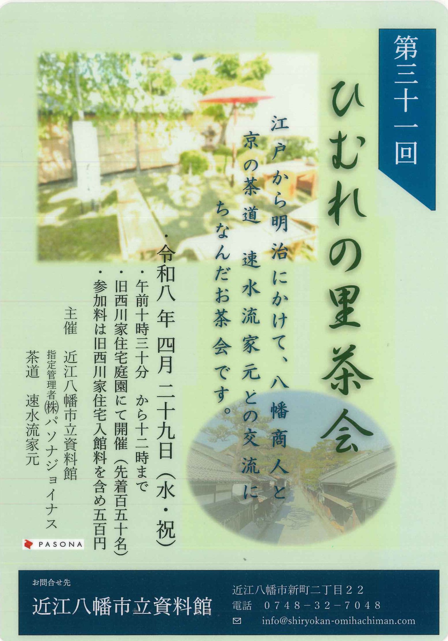 ホームお知らせ【重要文化財 旧西川家住宅】第31回ひむれの里茶会 2026年4月9日 【重要文化財 旧西川家住宅】第31回ひむれの里茶会 江戸から明治にかけて八幡商人と京の茶道 速水流家元との交流がありました。 この交流にちなみ毎年、速水流家元と近江八幡市立資料館(指定管理者㈱パソナジョイナス) との共催で、重要文化財旧西川家住宅にお茶会を実施しています。 今回は4月29日(水・祝)の10時30分より庭園にて開催(雨天の場合室内)いたします。 参加料は、入館料を含め500円で、先着150名様です。 ※予約不要 お知らせ一覧
